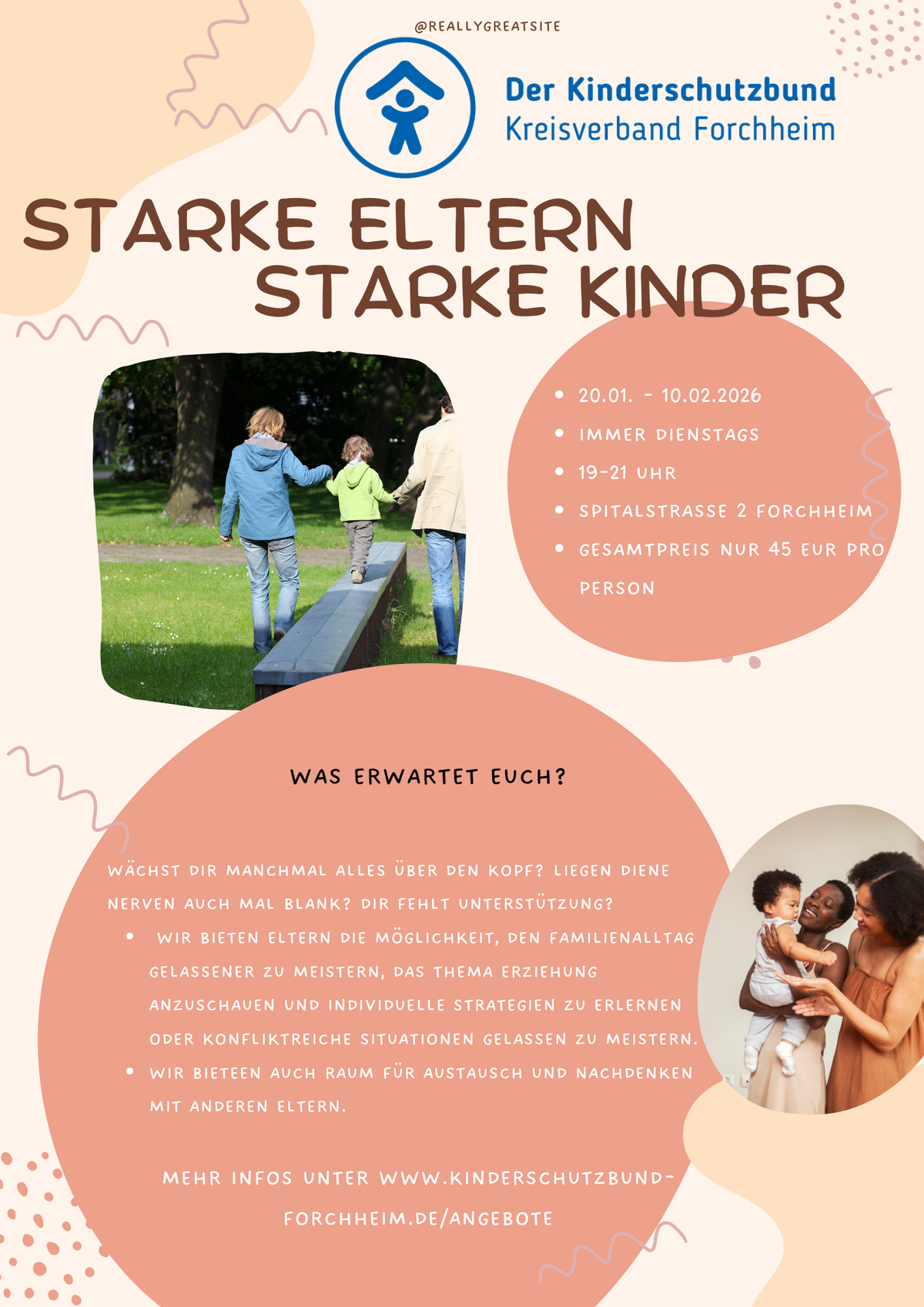 Der Kurs bietet Raum für Austausch, stärkt das Selbstvertrauen der Eltern und vermittelt hilfreiche Erziehungsstrategien – für mehr Freude und weniger Stress im Alltag. Informationen findet Ihr auf dem Flyer oder direkt in unserer Geschäftsstelle. Eine einfach Email mit Rückrufnummer reicht uns als Anmeldung! Wir freuen uns auf Euch!