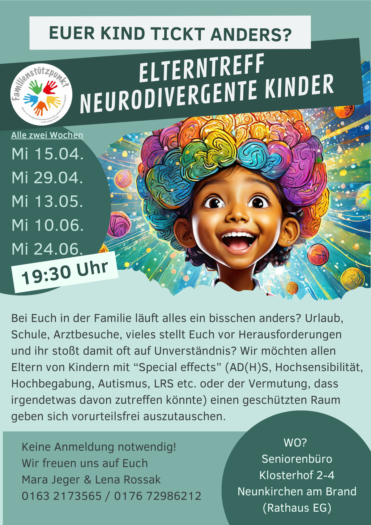 Bei Euch in der Familie läuft alles ein bisschen anders und ihr stoßt damit oft auf Unverständnis? Urlaub, Schule, Arztbesuche, vieles stellt Euch vor Herausforderungen? Wir möchten allen Eltern von Kindern mit “Special effects” (AD(H)S, Hochsensibel, Hochbegabt, Autismus,etc....) einen geschützten Raum geben sich vorurteilsfrei auszutauschen und gegenseitig zu unterstützen. Keine Anmeldung notwendig!