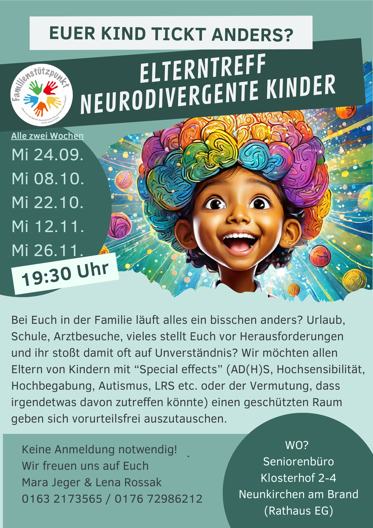 Bei Euch in der Familie läuft alles ein bisschen anders und ihr stoßt damit oft auf Unverständnis? Urlaub, Schule, Arztbesuche, vieles stellt Euch vor Herausforderungen? Wir möchten allen Eltern von Kindern mit “Special effects” (AD(H)S, Hochsensibel, Hochbegabt, Autismus,etc....) einen geschützten Raum geben sich vorurteilsfrei auszutauschen und gegenseitig zu unterstützen.Keine Anmeldung notwendig!