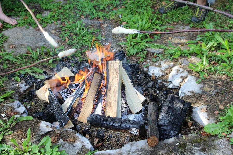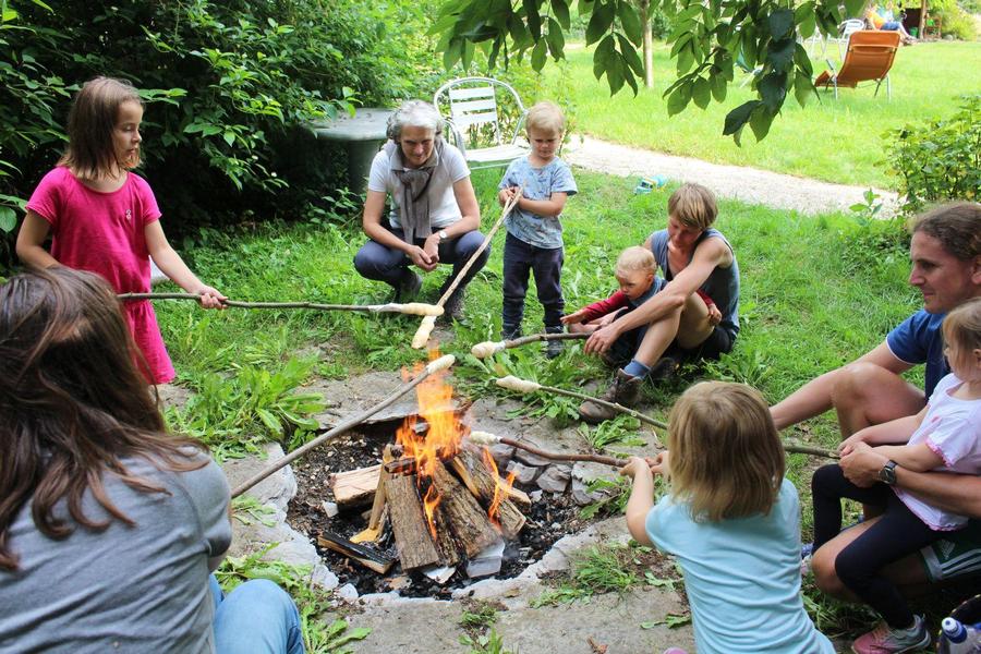 Gemeinsam entzünden wir ein Feuer im Garten der Pension Mühle. An Stöcken wird