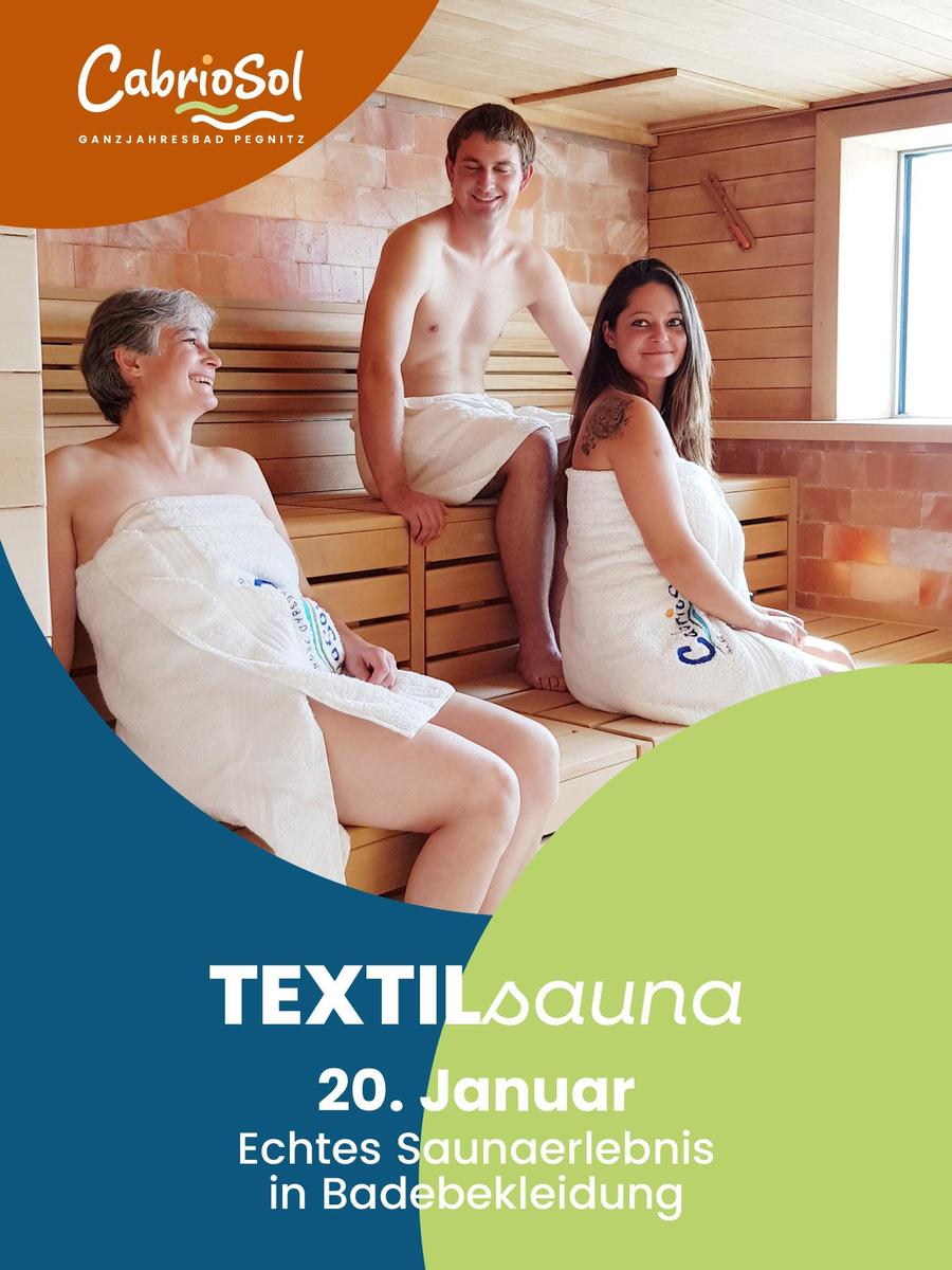 Für alle, die Sauna ganz entspannt genießen möchten, ohne dabei die Hüllen fallen zu lassen, ist unsere Textilsauna genau das Richtige. Schwitzen in Badebekleidung sorgt für ein angenehmes, ungezwungenes Saunaerlebnis – ideal für Einsteiger und alle, die es locker mögen! Kommt vorbei und erlebt es selbst – wir freuen uns auf euch!