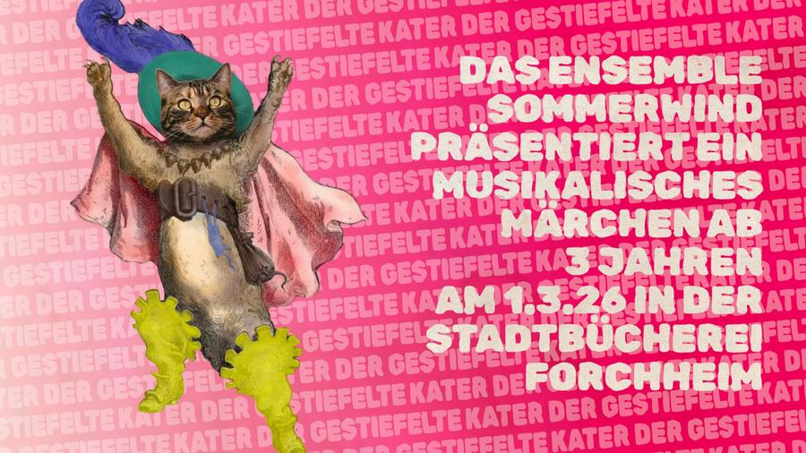 Die Stadtbücherei Forchheim lädt gemeinsam mit dem Ensemble SommerWind zum musikalischen Märchen „Der gestiefelte Kater“ ein: „Es war einmal ein Müller, der hatte drei Sohne, seine Mühle, einen Esel und einen Kater“ - einen gestiefelten Kater! Schon seit mehr als 200 Jahren begeistert das Märchen vom gestiefelten Kater und seinen pfiffigen Ideen Jung und Alt. Ihr kennt das Märchen bereits? - Das dachten wir auch...