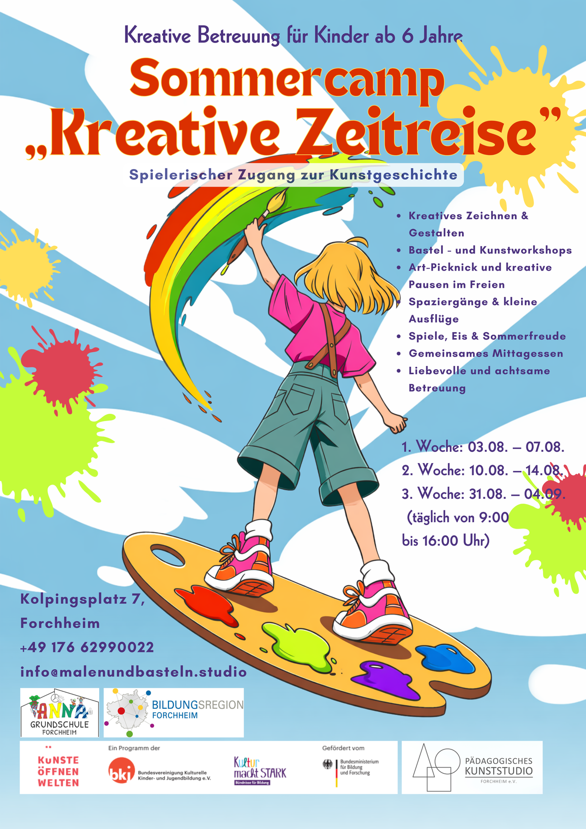 Im Rahmen des Ferienprogramms „Kunstzeitreise“ erwartet Kinder eine abwechslungsreiche Woche voller kreativer Workshops, Spiele, Bewegung und gemeinsamer Aktivitäten. Die Teilnehmenden tauchen ein in verschiedene Epochen – von der Steinzeit bis in die Zukunft – und gestalten eigene Kunstwerke mit unterschiedlichen Materialien und Techniken. Die Kinder zeichnen und malen zu historischen Themen; basteln und bauen eigene kreative Objekte; experimentieren mit Farben, Formen und Materialien; lernen Kunst aus verschiedenen Zeiten kennen; nehmen an Spielen und kreativen Gruppenaufgaben teil; machen Spaziergänge und kleine Ausflüge; verbringen kreative Pausen im Freien (Art-Picknick).